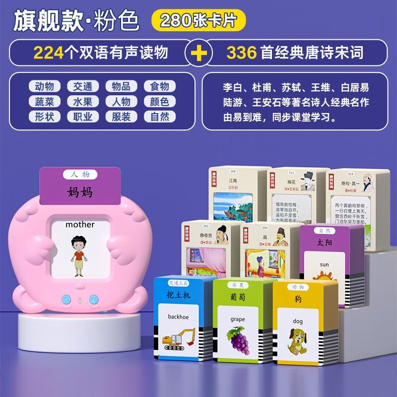 ¥34 馨铂斯 唐诗早教插卡机 儿童插卡片早教机双语识字学习机USB充电版 粉色早教机+唐诗336首+112张卡片 99