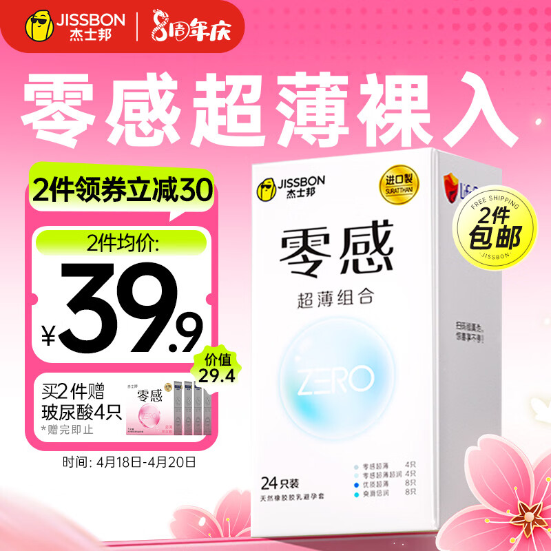 ¥54.9 杰士邦 避孕套超薄 安全套 ZERO零感24只组合 隐形裸感 男用套套 计生用品 54.9