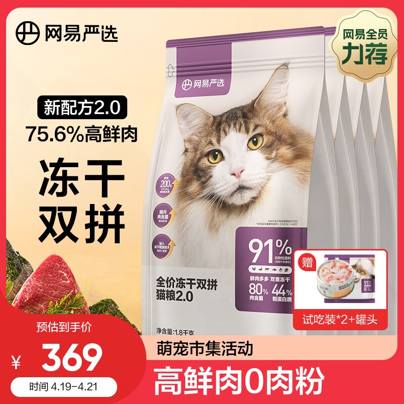 ¥389 网易严选 全价冻干双拼猫粮宠物主粮幼猫成猫全价天然无谷粮猫咪食品7.2kg 409