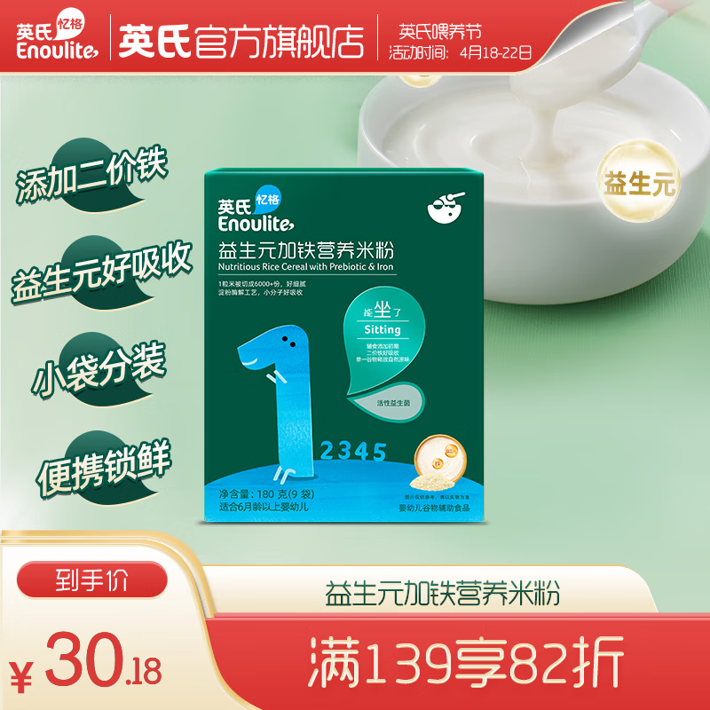 ¥31.8 英氏(Engnice)米粉婴儿高铁独立小包装宝宝米粉荤素果蔬6-12个月米糊婴儿细腻 【1阶6月+】益生元加铁便携 180g 36.8