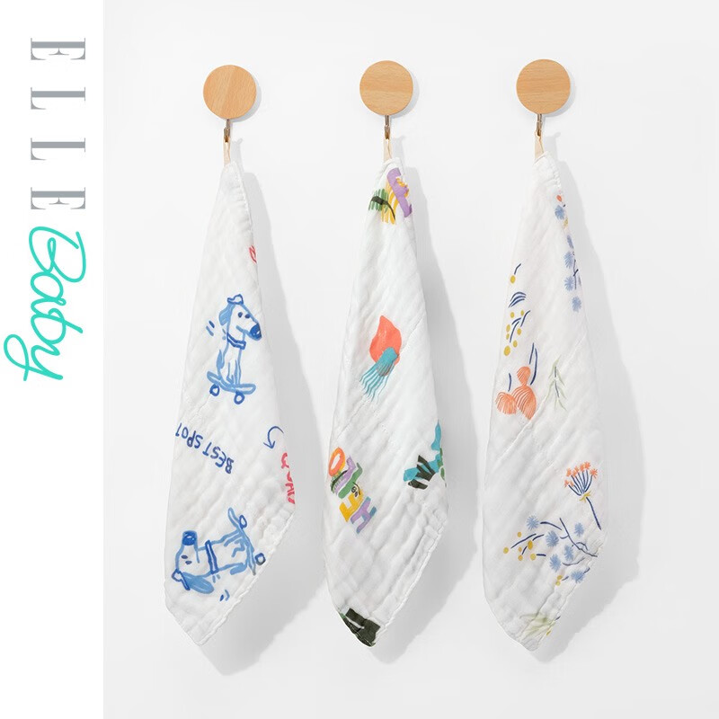 ¥9.9 ELLE BABY儿童方巾a类纯棉纱布婴儿口水巾洗脸洗澡小毛巾 婴儿方巾孕妈洗脸巾三条花色随机 39.9