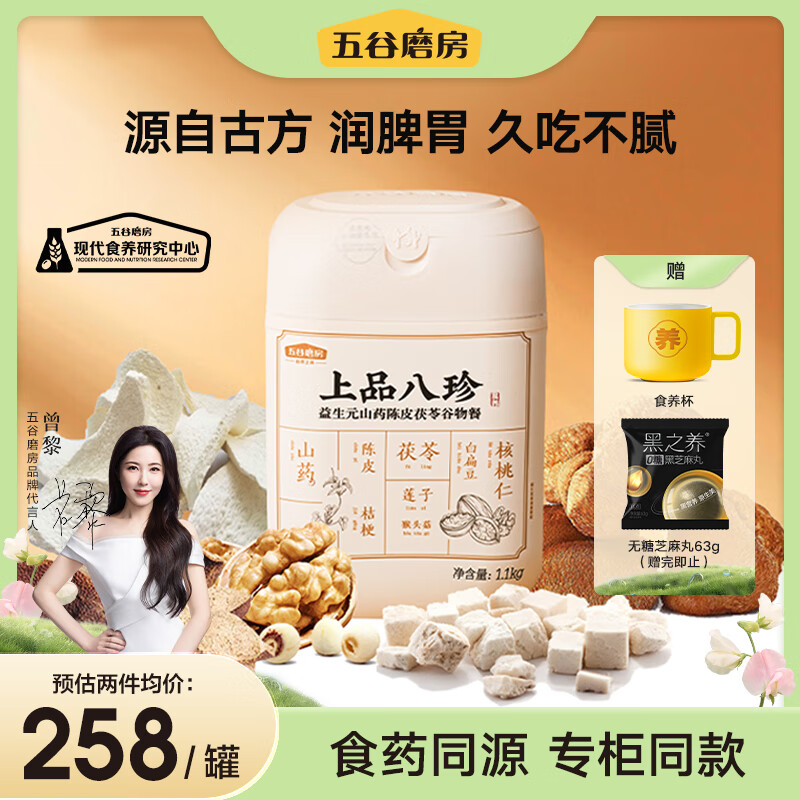 ¥268 五谷磨房 上品八珍益生元莲子茯苓陈皮猴头菇山药即食米糊脾胃代餐送长辈早餐八珍粉1100g 线下同款 288