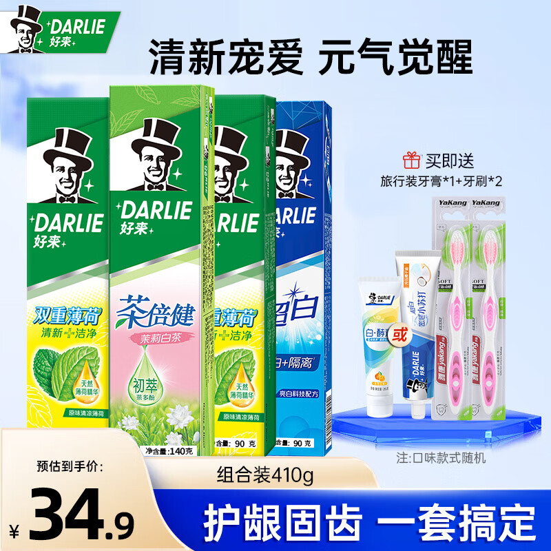 ¥53.9 好来(DARLIE)黑人牙膏 超白竹炭星耀白清新口气 亮白防蛀固齿 护龈牙渍黄牙 清新亮白90g*3+140g 59.9