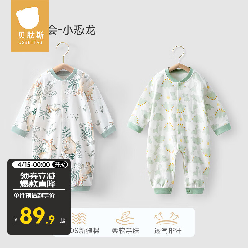 ¥79.9 贝肽斯婴儿连体衣夏季新生儿衣服春秋宝宝打底纯棉长袖哈衣室内爬行服 森林聚会+小恐龙(2件装)-四季 66码 89.9