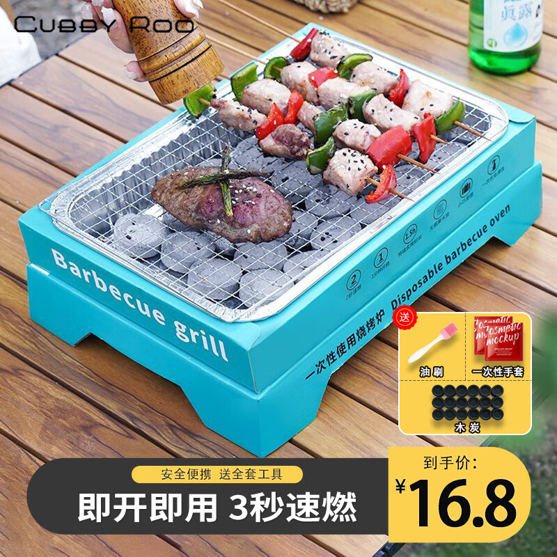 ¥14.8 CUBBY ROO一次性烧烤炉套装室内大号可续航木碳烤炉速燃碳户外烧烤架家用 【高配】24块碳+烤网烤盘油刷 15.8