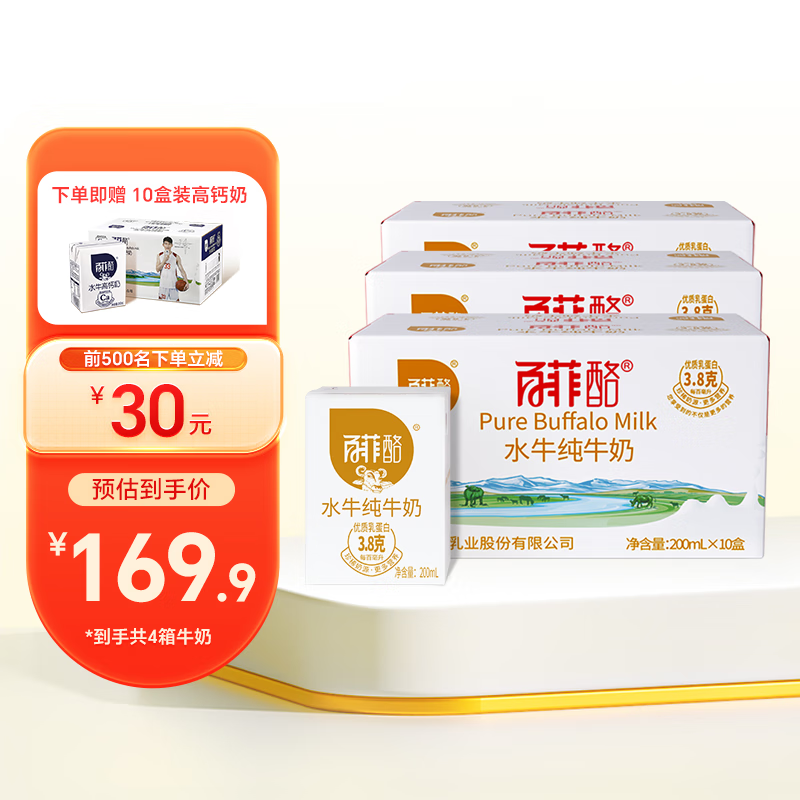 ¥159.9 百菲酪 水牛纯牛奶 整箱牛奶3.8g优质乳蛋白早餐奶 200ml*10盒*3箱 189.9