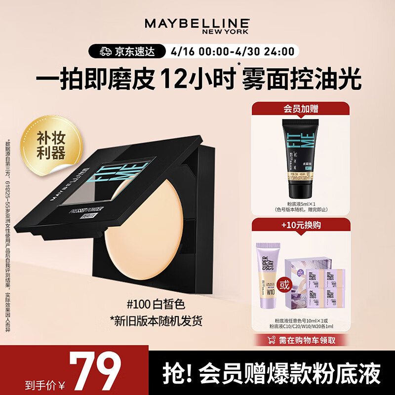 ¥74 美宝莲fitme定制柔雾粉饼小磨方定妆补妆遮瑕控油100白皙肤色生日礼物 79