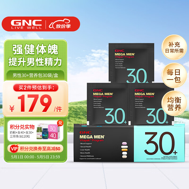 ¥215 GNC健安喜 男性Vitapak每日营养包男士专属定制 复合维生素多种营养 海外原装进口 【男性30+】强健体魄(有效期至24.12.31) 225