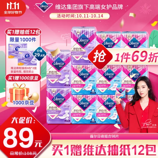 42.9元包邮!薇尔V感超薄日夜组合装98片+维达棉韧100抽*12包(返10元京豆后)