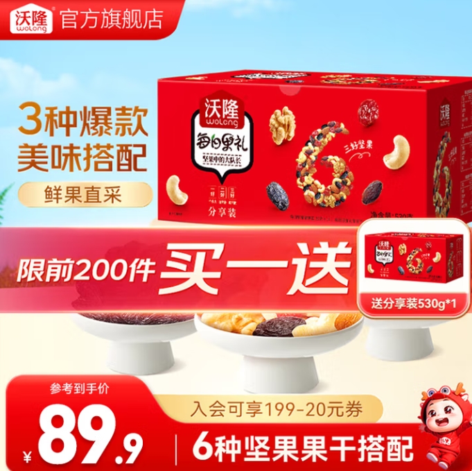 69.9元包邮!沃隆纯坚果禮盒530g/箱 买一送一
