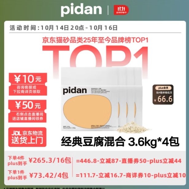 55.69元!pidan 经典混合猫砂 豆腐膨润土木薯60%:30%:10%混合 3.6kg*4包