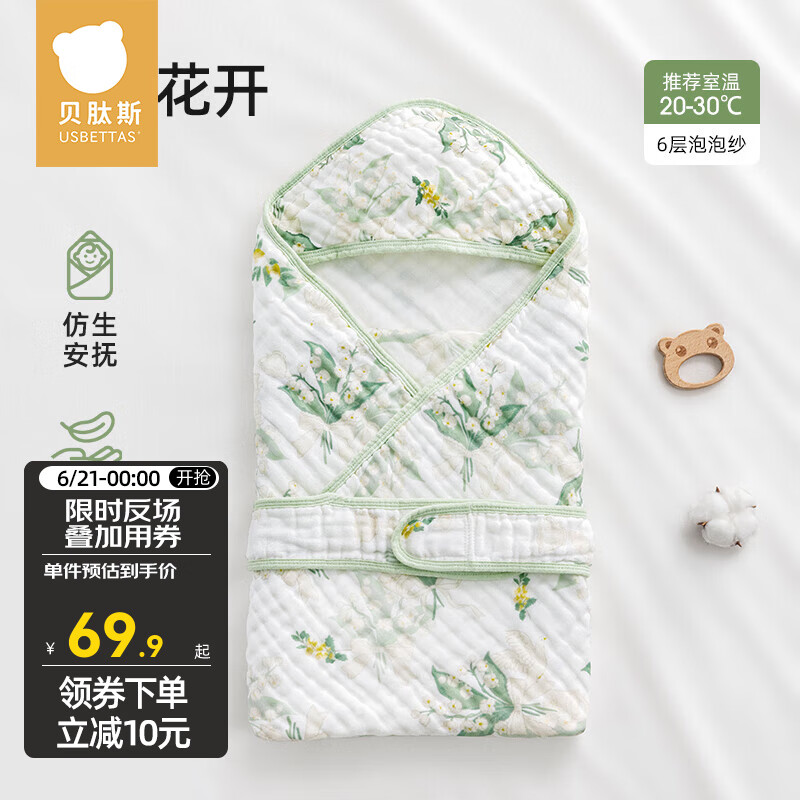 ¥49.9 贝肽斯泡泡纱防惊跳睡袋新生儿包被初生婴儿春夏季包单纯棉纱布抱被 初夏【6层 20-30°】铃兰花开 90x90cm 69.9