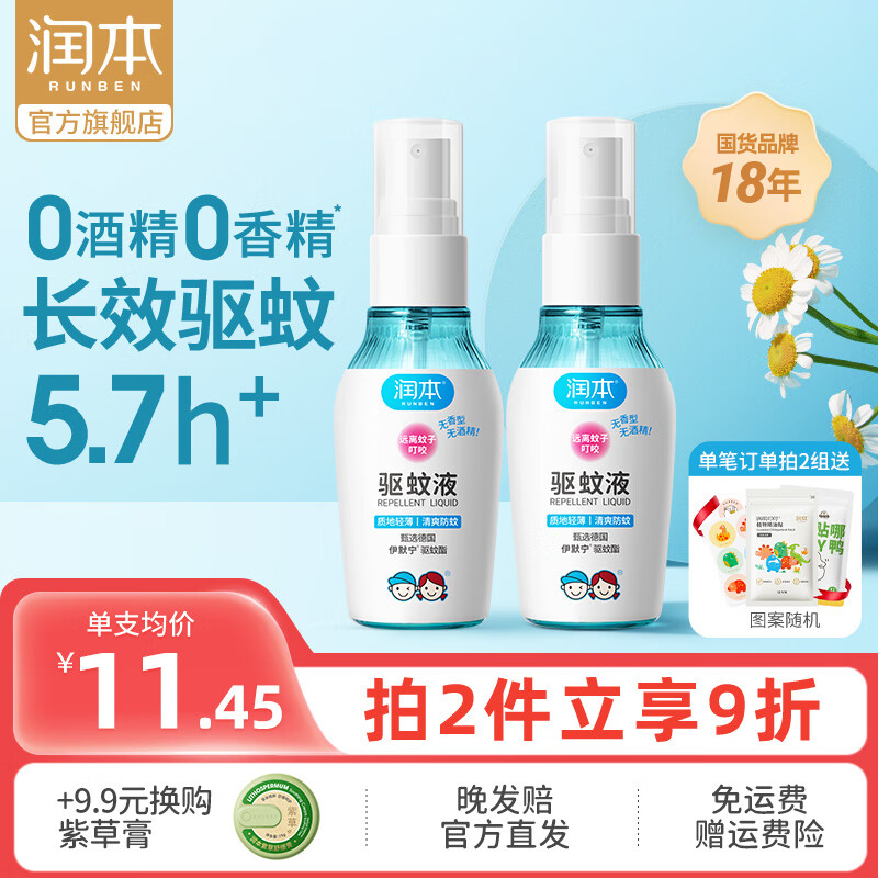 ¥12.9 润本(RUNBEN)驱蚊液婴儿童专用户外防蚊喷雾宝宝驱蚊花露水防蚊虫便携蚊怕水 50ml 2瓶 【新客优选便携装】 22.9