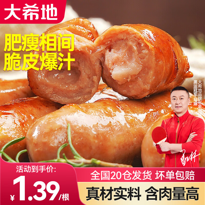 ¥21.9 大希地 火山石烤肠套装组合午餐肉早餐三明治手抓饼伴侣烧烤食材 醇肉肠原味1斤10根+鸡排80g*5 48.9