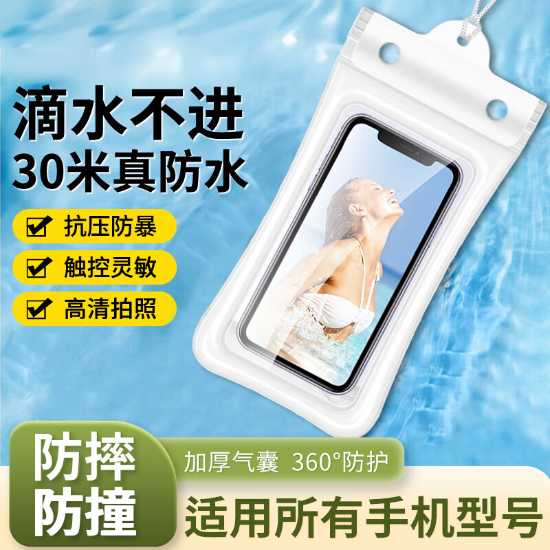 ¥7.9 勒盛手机防水袋可触屏防水套游泳潜水拍照外卖骑手防雨袋保护套配挂绳气囊360°防摔防撞华为苹果小米 白色—(触屏灵敏防摔防撞气囊漂浮配挂绳)8级防水 9.9