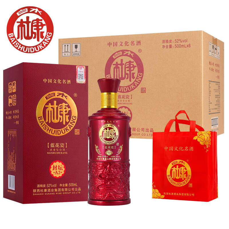 ¥209 白水杜康蓝花瓷封坛A2白酒52度500ml*6瓶浓香型白酒整箱特价礼盒 52度 500mL 6瓶 999