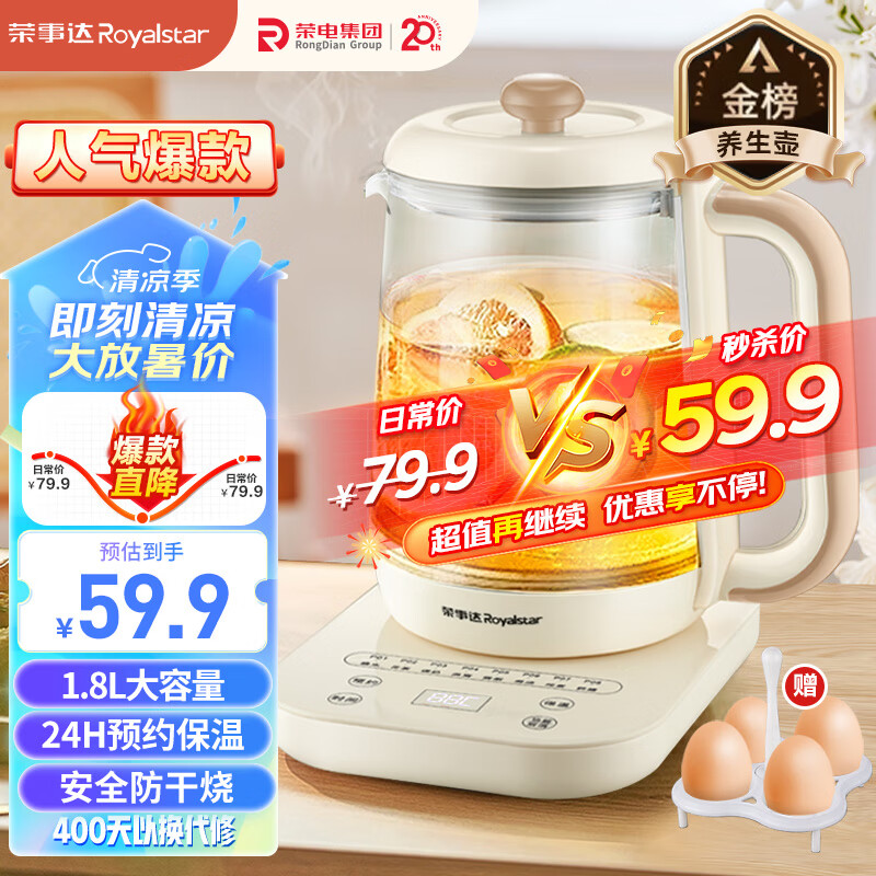 ¥49.9 荣事达(Royalstar)养生壶煮茶壶烧水壶电热水壶开水壶恒温壶玻璃花茶壶热奶器预约自动保温1.8L家用办公室YSH18L28 79.9
