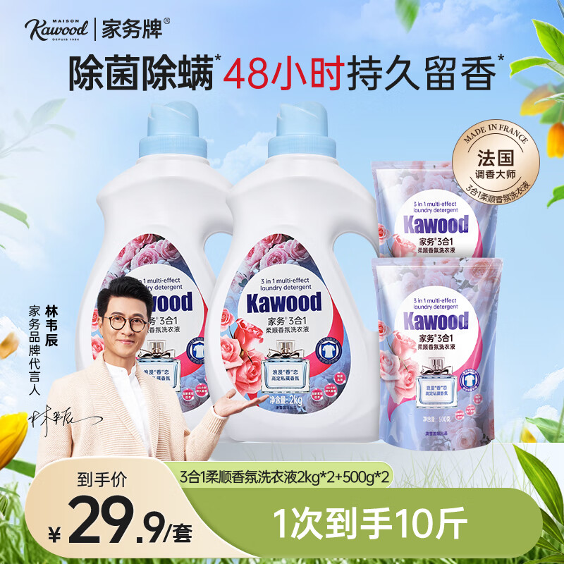 ¥19.9 澳雪(accen)家务牌3合1柔顺香氛洗衣液10斤(2kg*2瓶+500g*2袋) 29.9