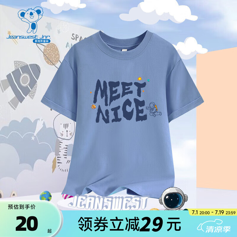 ¥20 真维斯男童上衣2024夏季新款圆领字母太空人印花套头短袖T恤衫KD 水蓝2620 140cm 49
