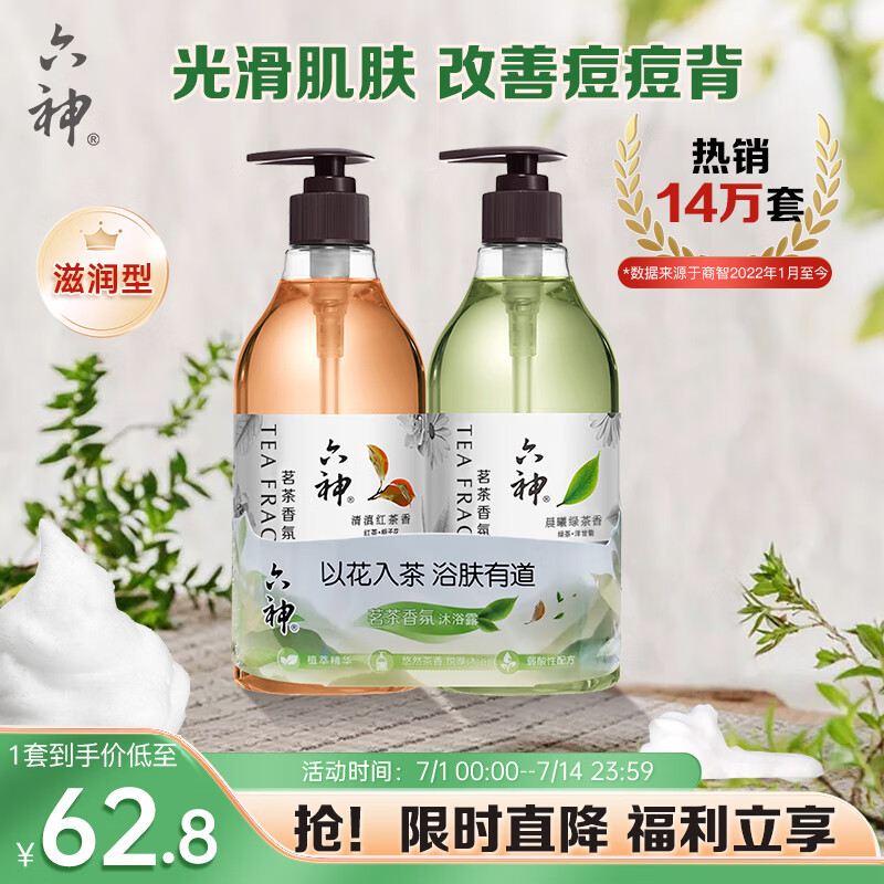 ¥32.8 六神茗茶植萃沐浴露套装清曦龙井475ml+午日滇红475ml(香氛控油 滋润) 62.8