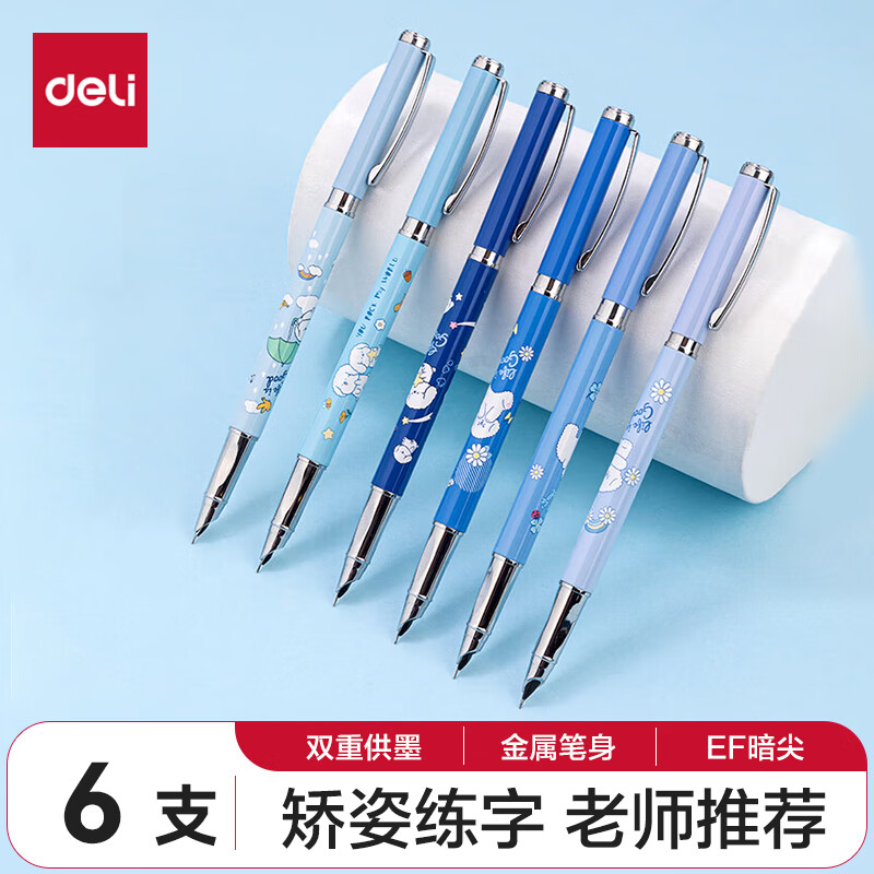 ¥18 得力(deli)EF暗尖金属钢笔 中小学生初学练字矫姿墨水笔套装 可换墨囊 带吸墨器 6支/盒 SF525 36