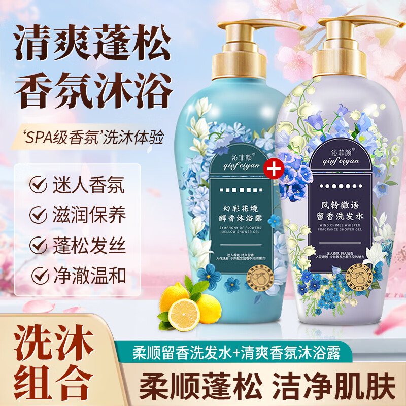 ¥19.9 qinfeiyan柔顺洗发水香氛清爽顺滑头皮油腻清洁花香焗油烫染洗护男女 留香洗发水+醇香沐浴露 500ml 2瓶 49.9