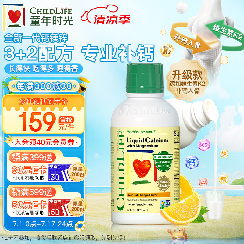 ¥99 ChildLife童年时光钙镁锌 柠檬酸液体钙 婴幼儿童补钙补锌乳钙 维生素K2+D3 进口 6个月+ 473ml/瓶 【单瓶】 159