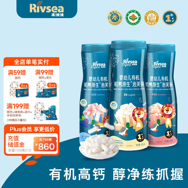 ¥108.4 禾泱泱婴幼儿稻鸭原生泡芙条 宝宝零食6个月以上 高钙方便携带 有机稻鸭原生泡芙条3罐(原味+蓝莓+草莓) 119.4