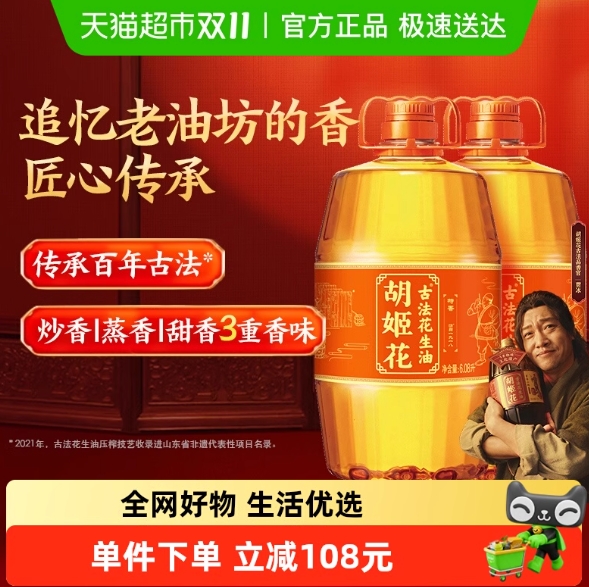 196元包邮!胡姬花古法花生油6.08L*2桶