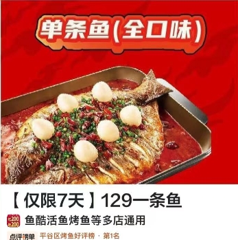 【美团到店】117元!鱼酷活鱼烤鱼 一条鱼