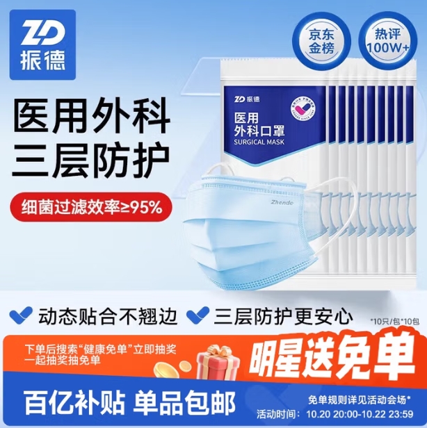 9.9元包邮!金士达 一次性医用外科口罩2盒共100只