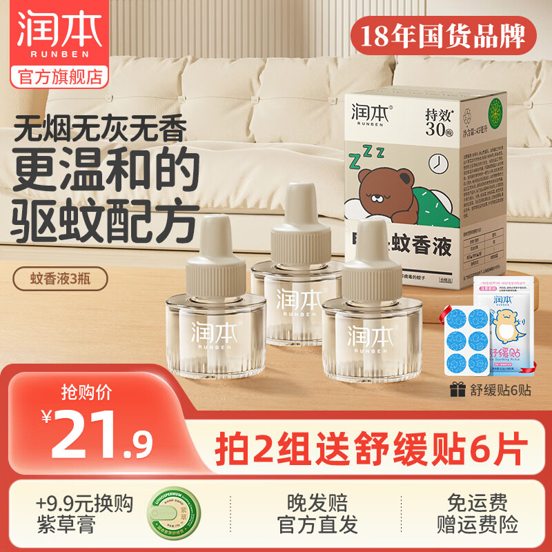 ¥16.9 润本(RUNBEN)婴儿蚊香液定时儿童无香型电蚊香宝宝驱蚊液灭蚊器防蚊水家用驱蚊 45ml 3瓶 -无器【可用90晚】 21.9