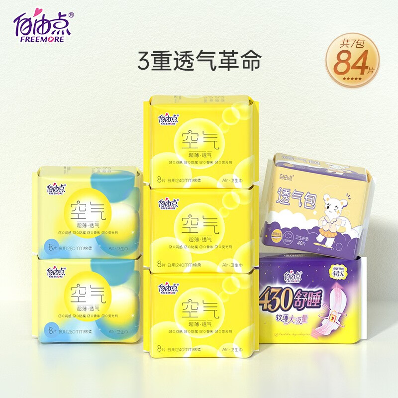 ¥33.9 自由点(FREEMORE)空气卫生巾日夜用超薄透气组合姨妈巾 日夜组合7包84片 46.9