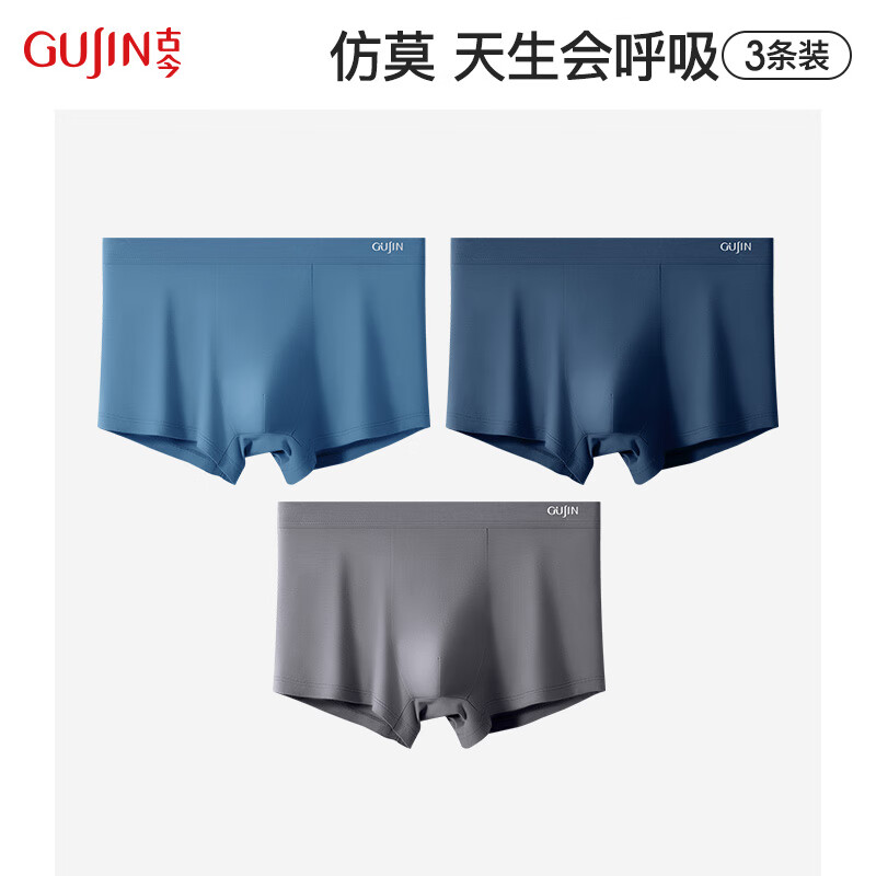 ¥49 GUJIN古今男士内裤仿莫宽松透气柔软短裤男四角裤衩男平角短裤3条装 中蓝-深蓝-深灰 3XL/185 59