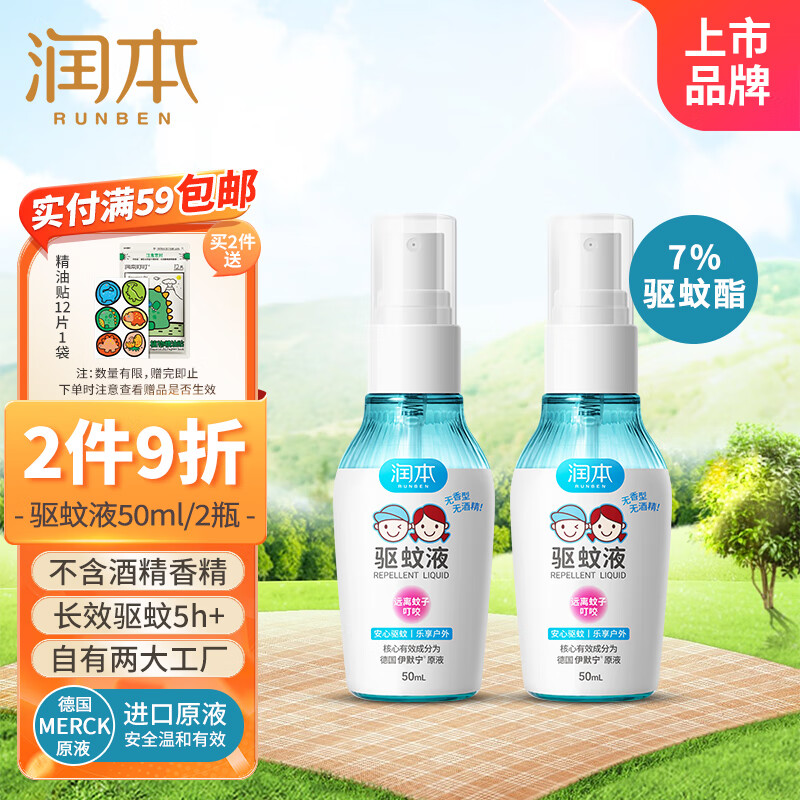 ¥12.9 润本(RUNBEN)驱蚊液驱蚊喷雾50ml×2支儿童宝宝蚊虫叮咬防蚊花露水7%驱蚊酯无香 22.9