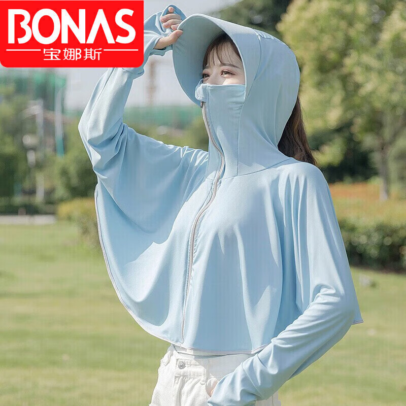¥29.9 宝娜斯(BONAS)冰丝骑行遮阳衣打底衣女长袖夏季薄款透气披肩上衣 加长帽-蓝色 均码 适合80-160斤 89.9