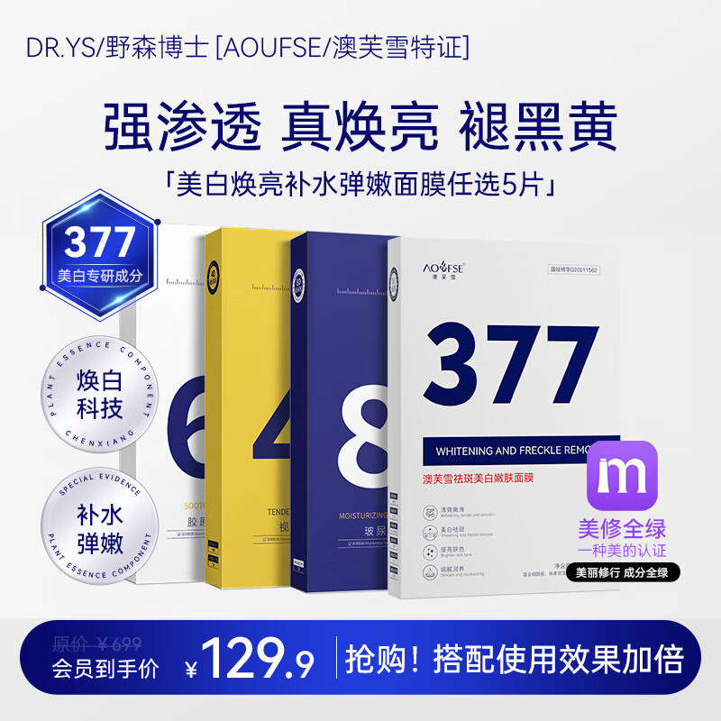 ¥429.9 DR. YS 野森博士【AOUFSE特证】377专研美白淡斑面膜组合可选5片/盒D 四款面膜组合 四盒【拍一发四】 519.9