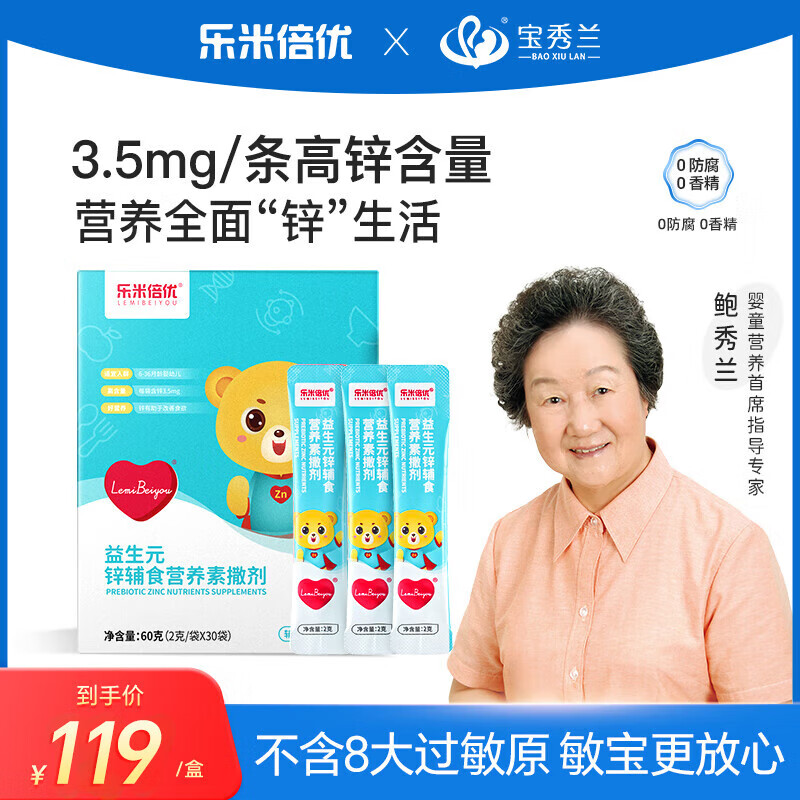¥114 乐米倍优 婴幼儿锌撒剂 宝宝辅食高含量复合维生素VD强化铁锌益生元营养宝宝爱吃干饭香 锌辅食营养撒剂【30袋/盒】 119