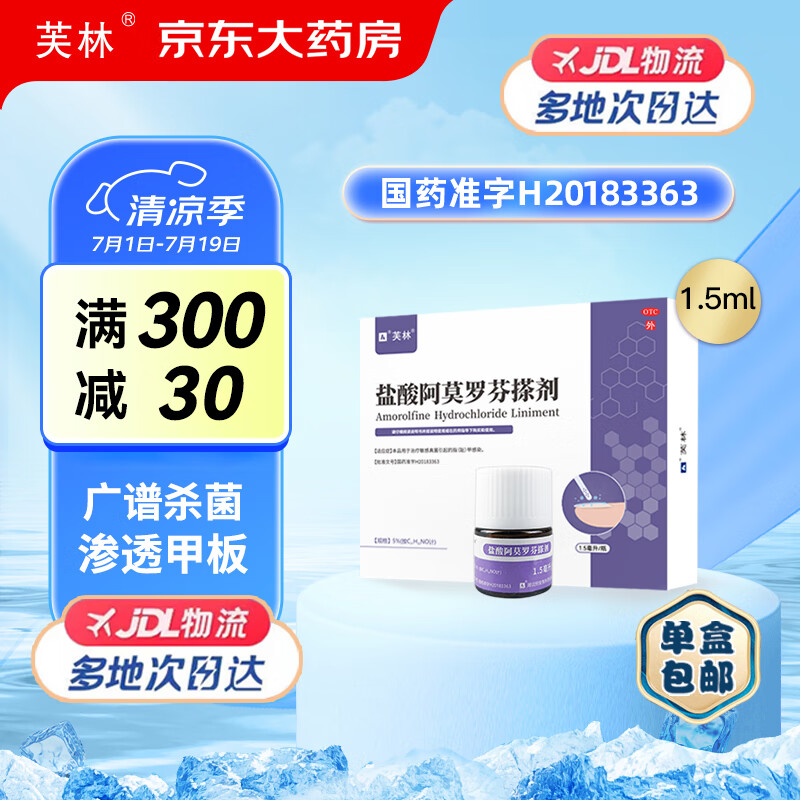 ¥109 芙林 盐酸阿莫罗芬搽剂 5%*1.5ml/瓶/盒治疗灰指甲专用药灰指甲根治官方正品真菌感染特皮肤用药抑菌效药指(趾)甲感染 119