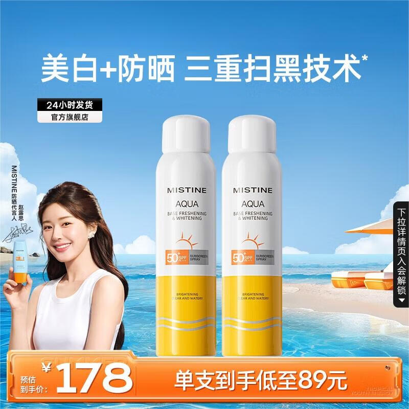 ¥39 蜜丝婷(Mistine)美白小黄喷防晒喷雾清仓特价剩余有效期不少于9个月 美白防晒喷雾 120ml *2 178