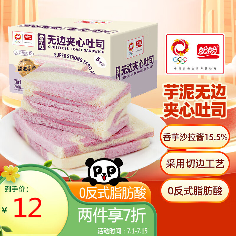 ¥11.9 盼盼芋泥无边夹心吐司 面包三明治早餐休闲零食下午茶点心 300g/箱 14.9
