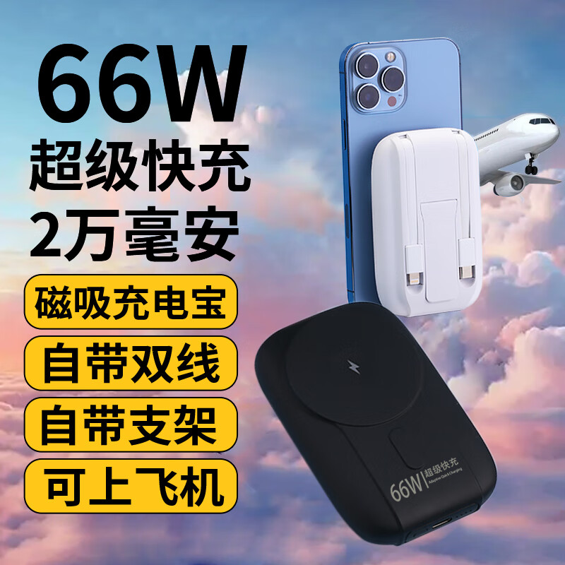 ¥99 勒盛磁吸充电宝自带线可上飞机66W快充20000毫安移动电源小巧超薄便捷适用华为手机magsafe充电宝苹果 经典黑旗舰版(2万毫安)—66W自带双线+磁吸无线 179