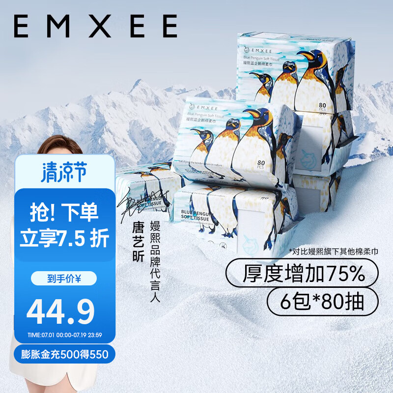¥51.9 嫚熙(EMXEE)绵柔巾蓝企鹅绵柔巾干湿两用手口可用婴儿洗脸巾宝宝80抽 蓝企鹅绵柔巾6包 59.9