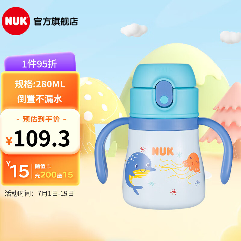¥45 NUK 316不锈钢儿童保温杯小学生水杯幼儿园吸管杯倒置不漏水杯 蓝色鲸鱼(带把手) 280ml 115