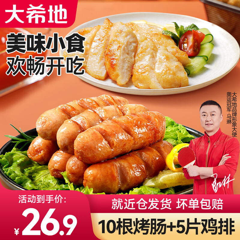 ¥21.9 大希地 火山石烤肠套装组合午餐肉早餐三明治手抓饼伴侣烧烤食材 醇肉肠原味1斤10根+鸡排80g*5 48.9