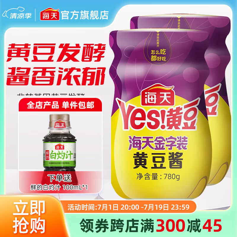 ¥19.8 海天豆瓣酱 下饭酱 拌面拌饭蘸大酱 黄豆酱调料调味酱拌面调料手抓饼 金字装黄豆酱780g*2+白灼汁100ml 30.8