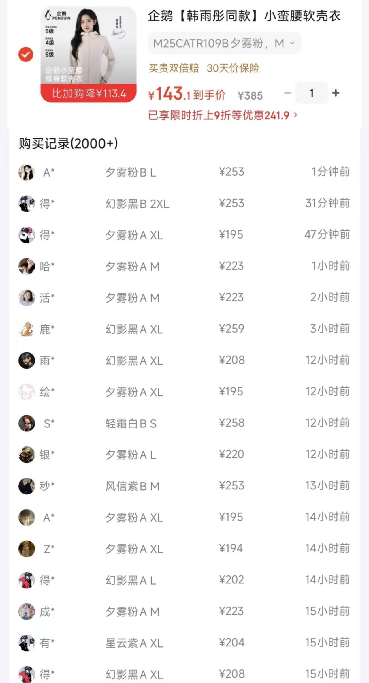 企鹅韩雨彤同款小蛮腰软壳衣,购物金叠加后到手价仅128元