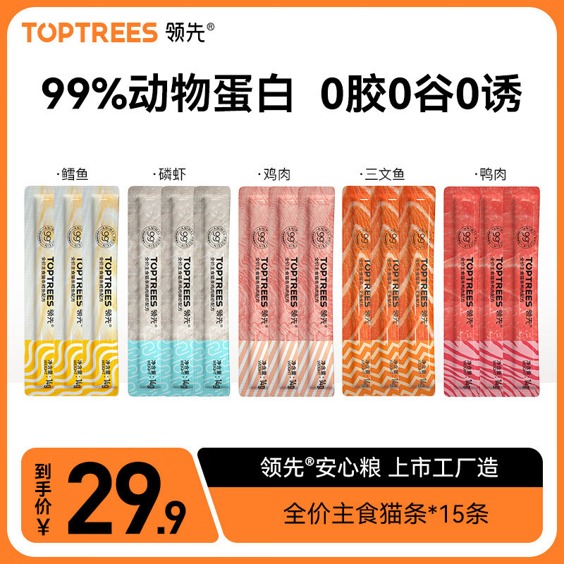 ¥9.9 Toptrees领先主食猫条全价成猫湿粮猫咪零食营养增肥猫条 15条随机发货 效期至25年8月 29.9