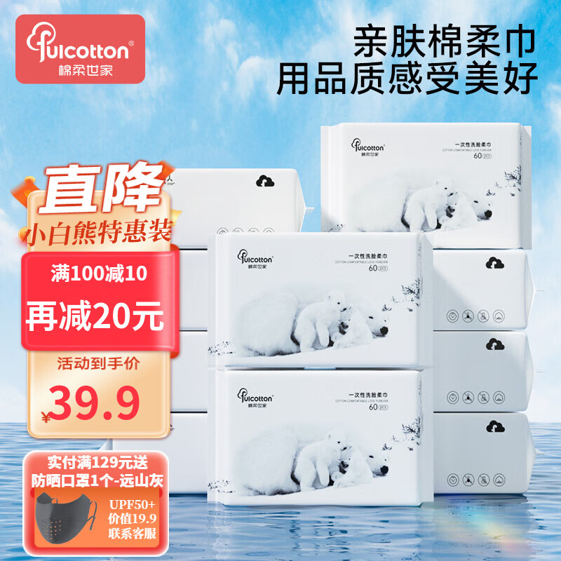 ¥47.9 棉柔世家(FulCotton)棉柔巾婴儿洗脸巾一次性擦脸洗面绵柔纸巾珍珠纹加厚 【99%购买】10包/600抽 【小白熊】20cm*15cm珍珠纹 59.9
