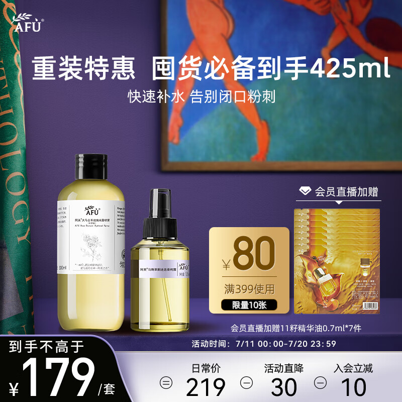 ¥149 【自营】阿芙(AFU)纯露爽肤水套装(玫瑰纯露300+马迷纯露125) 179